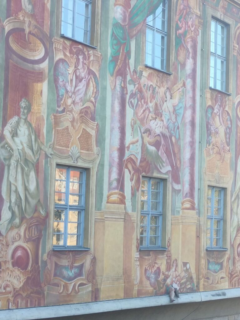 Two bridges connect Rathaus to either side of the riverbank. The Rathaus walls are decorated with murals. One notable aspect is a 3D leg protruding out of the painting.