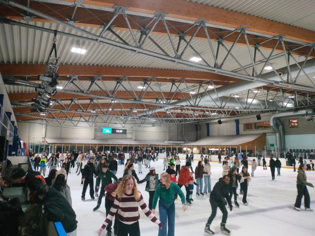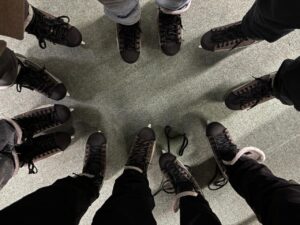 There were a lot of people at all levels of expertise there. Small kids who held on to penguins (skating aids) and others who were swift and could do hockey stops! We were like the small kids but without the penguins. So, we became the penguins falling and learning the hard way.
